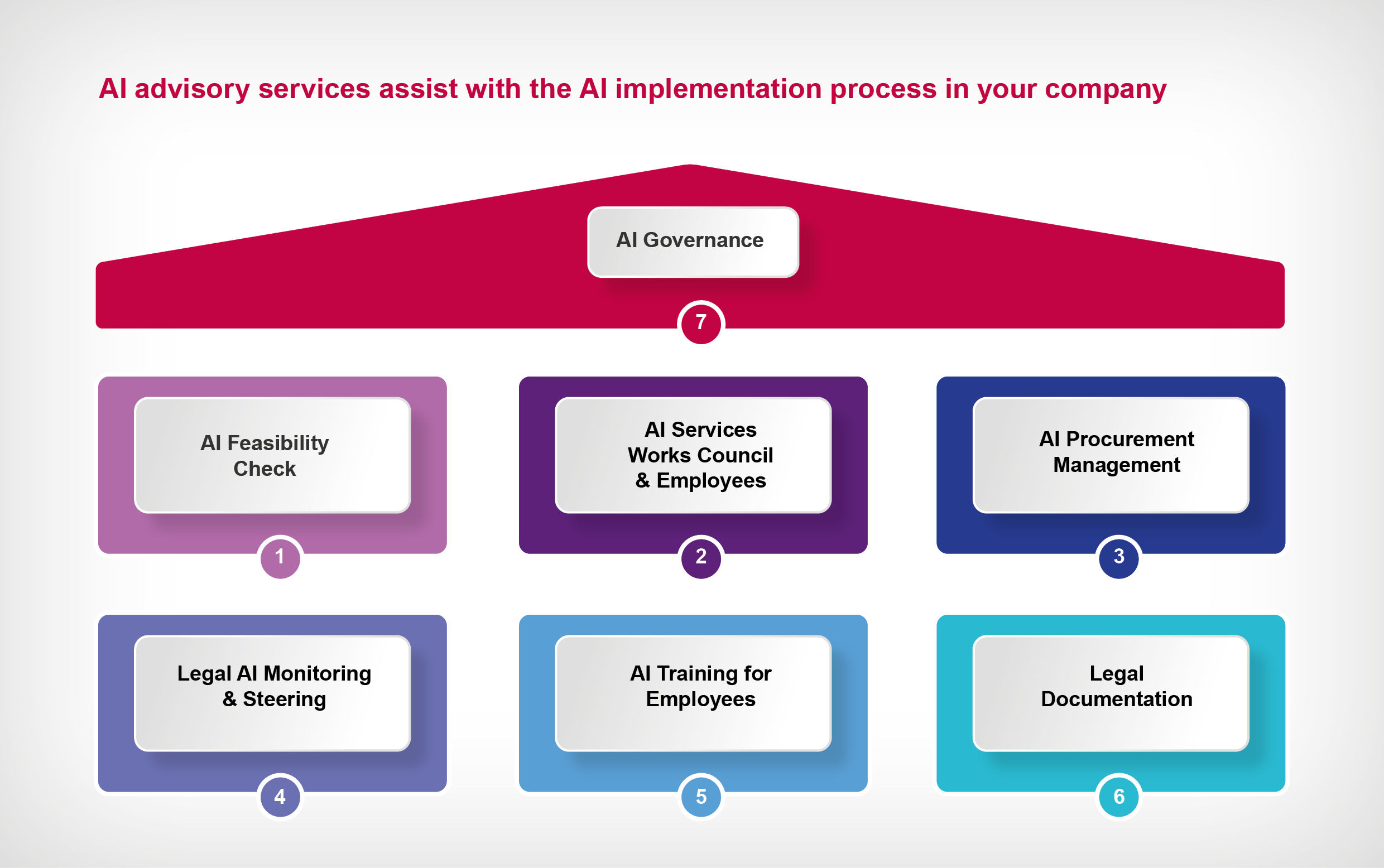 Working in close collaboration with your teams, our advisory services deliver a high level of innovation and added value you can measure. In this way, we ensure that your AI projects are both legally compliant and economically successful – from the initial idea to long-term implementation.